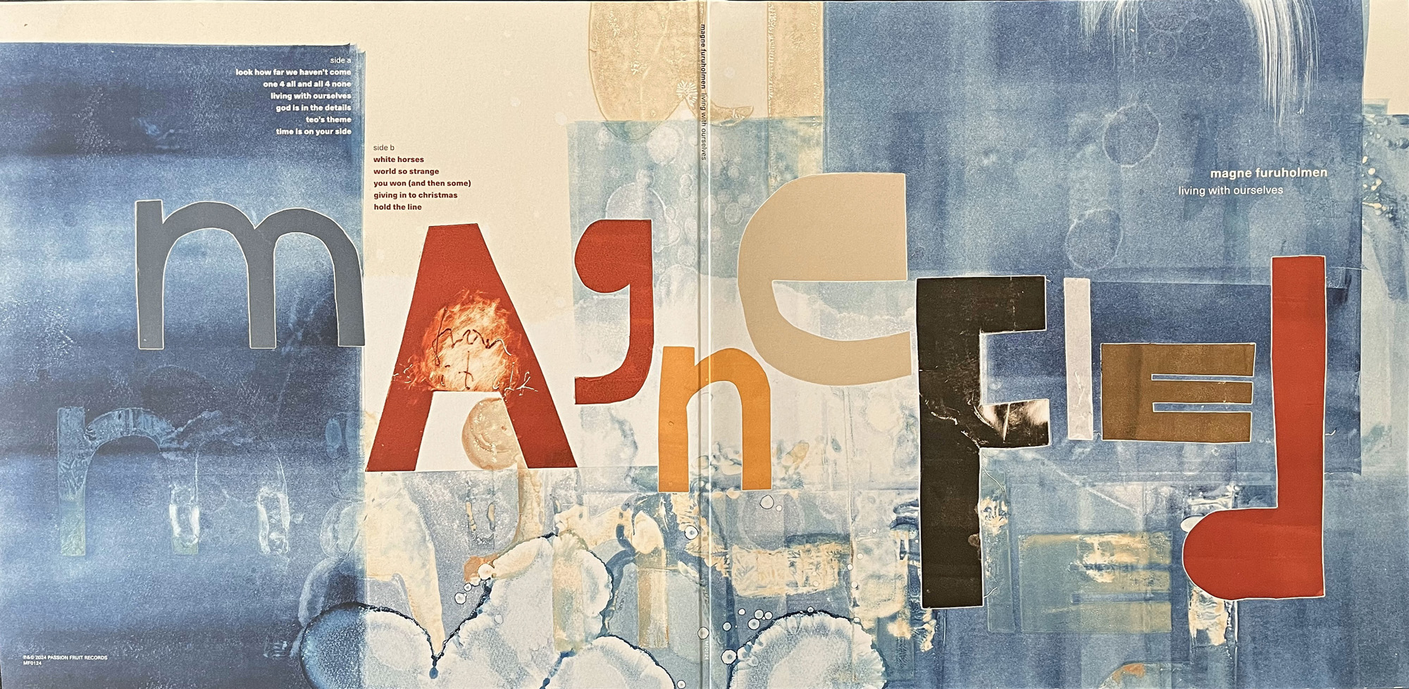 Magne's 11 track album "Living With Ourselves" is due for release in 2025. Magne has produced a special limited edition vinyl of the album which he has created himself by mixing colours, making each of the 200 pressings unique. They were made available to order on 1 November 2024 and sold out very quickly. The discs are a mix of red, orange, yellow, green and black colours and some are very different from others. The disc comes in a LP gatefold sleeve with cover design by Magne. It features one of his art prints with a blue & cream background and large grey, red, orange, beige, black white and brwon letters spelling out "mAgneFIEd" which goes across the front and back of the sleeve. magne furuholmen and living with ourselves are printed in small white letters towards the top of the front sleeve and the tracks are printed in two columns in small white and dark red letters on the reverse. The inside of the gatefold has a beige and white with paint/water splats background with the lyrics printed in columns across the sleeve. Each sleeve is individually numbered and signed. The disc labels also feature Magne's art, side a in blue, beige, white and grey colurs and side b with red, white, blue and orange.