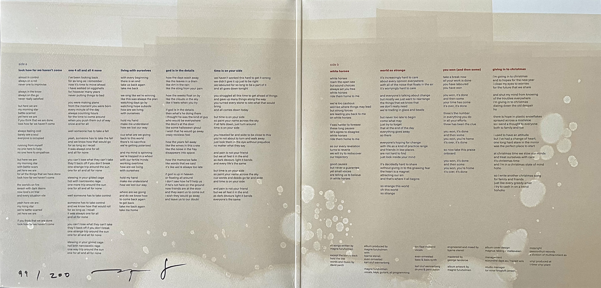 Tracks: look how far we haven’t come / one 4 all and all 4 none / living with ourselves / god is in the details / teo’s theme / time is on your side // white horses / world so strange / you won (and then some) / giving in to christmas / hold the line Limited vinyl